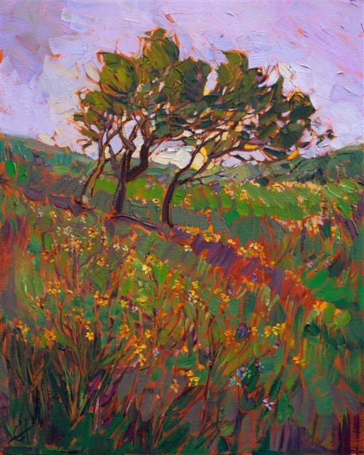 Style: "Open Impressionism" is a new style of painting developed by American artist Erin Hanson. The style is characterized by short, impasto brush strokes that are applied without layering, creating a mosaic or stained-glass appearance to the paintings. The paintings are created with a limited palette of colors, applied without blending or mixing upon the canvas, which adds a dimension of texture to each brush stroke. Inspired by classic impressionism, pointillism, and post-impressionism, Erin Hanson continues the tradition of impressionism into the modern day with her colorful and vivacious landscape paintings.
