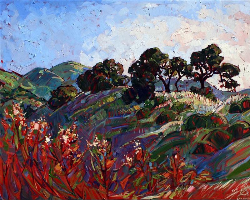Style: "Open Impressionism" is a new style of painting developed by American artist Erin Hanson. The style is characterized by short, impasto brush strokes that are applied without layering, creating a mosaic or stained-glass appearance to the paintings. The paintings are created with a limited palette of colors, applied without blending or mixing upon the canvas, which adds a dimension of texture to each brush stroke. Inspired by classic impressionism, pointillism, and post-impressionism, Erin Hanson continues the tradition of impressionism into the modern day with her colorful and vivacious landscape paintings.