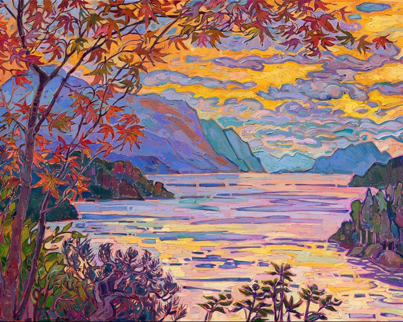 Note on varnishing: Erin’s paintings take six to eight weeks to dry, at which time we apply a retouching varnish, which allows the painting to complete the curing process while having a layer of protection against dirt and scuffs. The full curing process for an impasto oil painting takes at least two years. We are happy to assist in applying a final finishing varnish to your Erin Hanson oil painting once it has been dry for at least two years. Here is more information on how to care for your original oil painting.