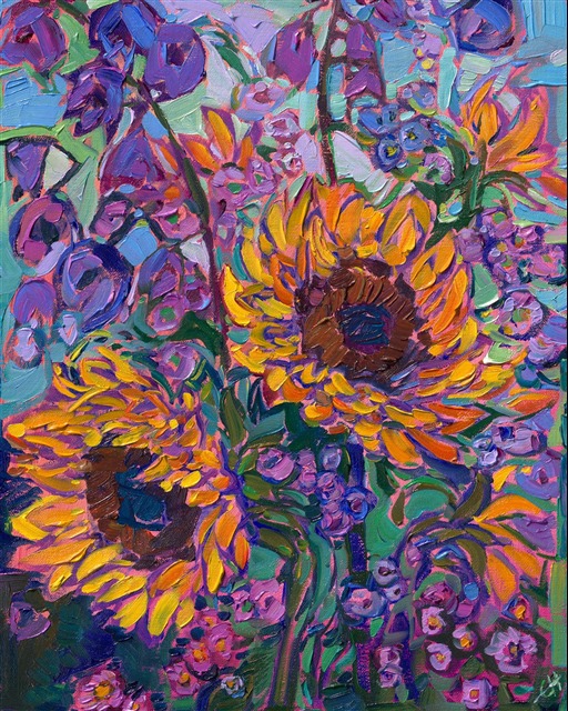 Impressionist blooms of sunflowers and violet flowers are painted with thick, expressive brushwork and vivid hues of oil paint. The luscious colors look good enough to eat.