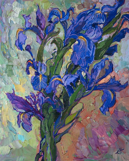 A bouquet of irises laying on the ground inspired me to paint the rich purple and ultramarine blooms resting against the reddish earth. The impasto brush strokes are expressive and highly textured, capturing the contours and rich hues of the flowers.