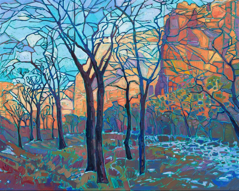"January Zion" was created on 1-1/2" canvas, with the painting continued around the edges. The painting arrives framed in a contemporary gold floater frame, ready to hang.