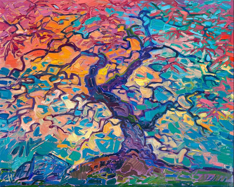 Style: "Open Impressionism" is a new style of painting developed by American artist Erin Hanson. The style is characterized by short, impasto brush strokes that are applied without layering, creating a mosaic or stained-glass appearance to the paintings. The paintings are created with a limited palette of colors, applied without blending or mixing upon the canvas, which adds a dimension of texture to each brush stroke. Inspired by classic impressionism, pointillism, and post-impressionism, Erin Hanson continues the tradition of impressionism into the modern day with her colorful and vivacious landscape paintings.