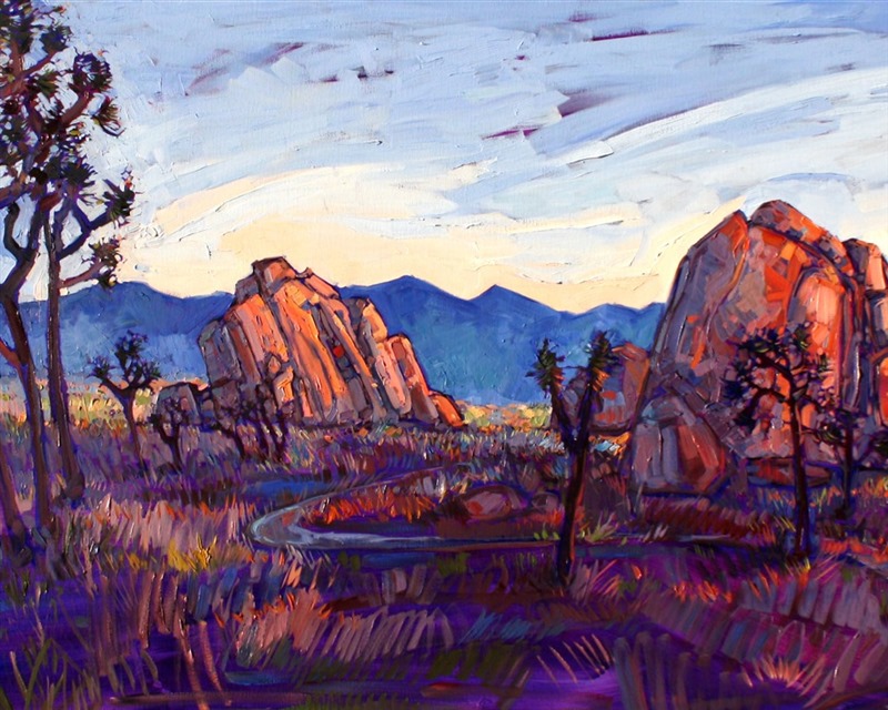 Style: "Open Impressionism" is a new style of painting developed by American artist Erin Hanson. The style is characterized by short, impasto brush strokes that are applied without layering, creating a mosaic or stained-glass appearance to the paintings. The paintings are created with a limited palette of colors, applied without blending or mixing upon the canvas, which adds a dimension of texture to each brush stroke. Inspired by classic impressionism, pointillism, and post-impressionism, Erin Hanson continues the tradition of impressionism into the modern day with her colorful and vivacious landscape paintings.