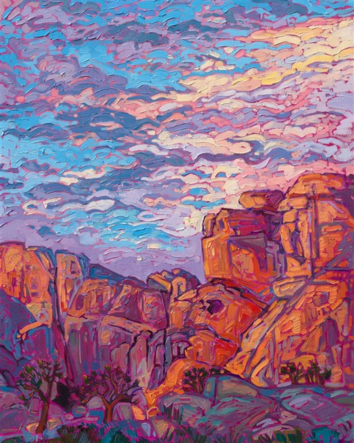 Note on varnishing: Erin’s paintings take six to eight weeks to dry, at which time we apply a retouching varnish, which allows the painting to complete the curing process while having a layer of protection against dirt and scuffs. The full curing process for an impasto oil painting takes at least two years. We are happy to assist in applying a final finishing varnish to your Erin Hanson oil painting once it has been dry for at least two years. Here is more information on how to care for your original oil painting.
