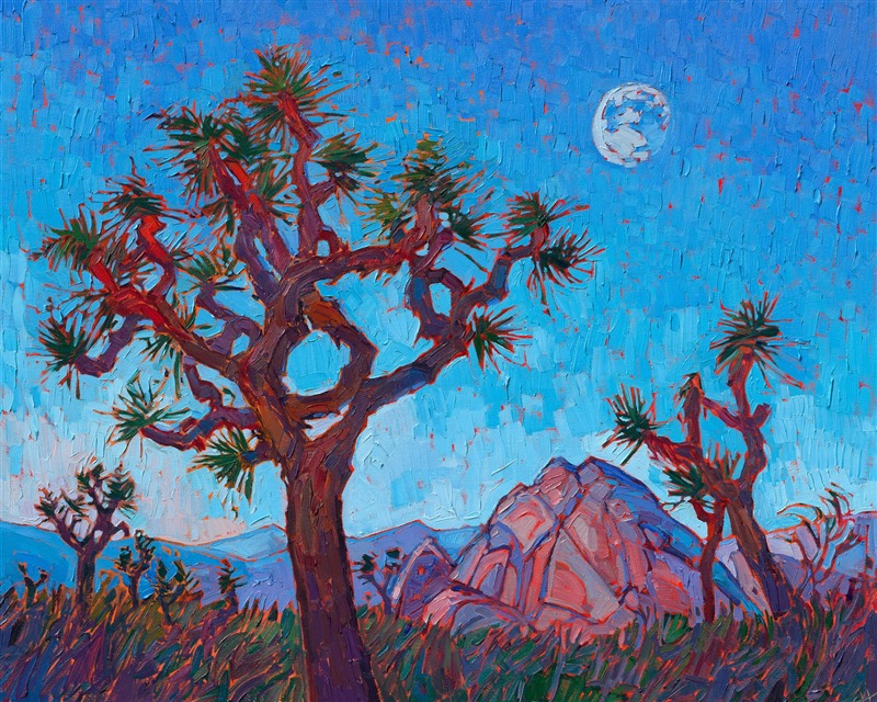 Note on varnishing: Erin’s paintings take six to eight weeks to dry, at which time we apply a retouching varnish, which allows the painting to complete the curing process while having a layer of protection against dirt and scuffs. The full curing process for an impasto oil painting takes at least two years. We are happy to assist in applying a final finishing varnish to your Erin Hanson oil painting once it has been dry for at least two years. Here is more information on how to care for your original oil painting.