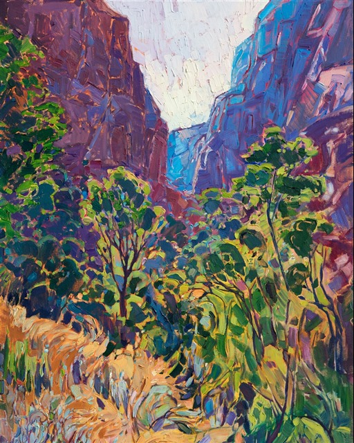 Style: "Open Impressionism" is a new style of painting developed by American artist Erin Hanson. The style is characterized by short, impasto brush strokes that are applied without layering, creating a mosaic or stained-glass appearance to the paintings. The paintings are created with a limited palette of colors, applied without blending or mixing upon the canvas, which adds a dimension of texture to each brush stroke. Inspired by classic impressionism, pointillism, and post-impressionism, Erin Hanson continues the tradition of impressionism into the modern day with her colorful and vivacious landscape paintings.