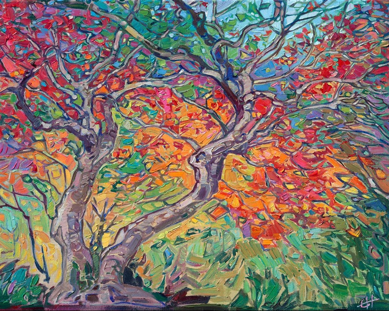 I love painting the twisting branches of Japanese maple trees. I found this grove of maples in the gardens of a Buddhist temple in Kyoto, Japan. The soft light accentuates the striking colors of cadmium red against green. Thickly applied brush strokes of oil paint create a mosaic of texture across the canvas.