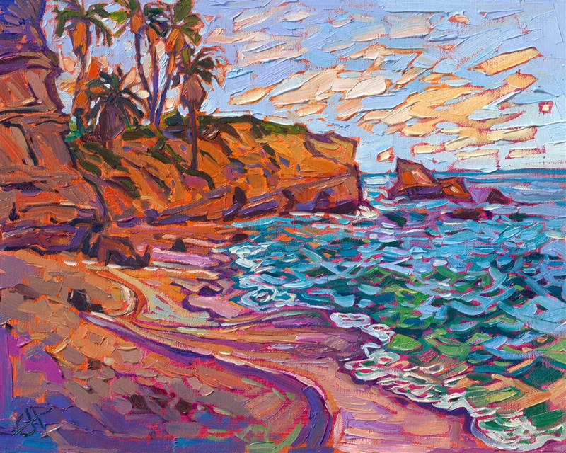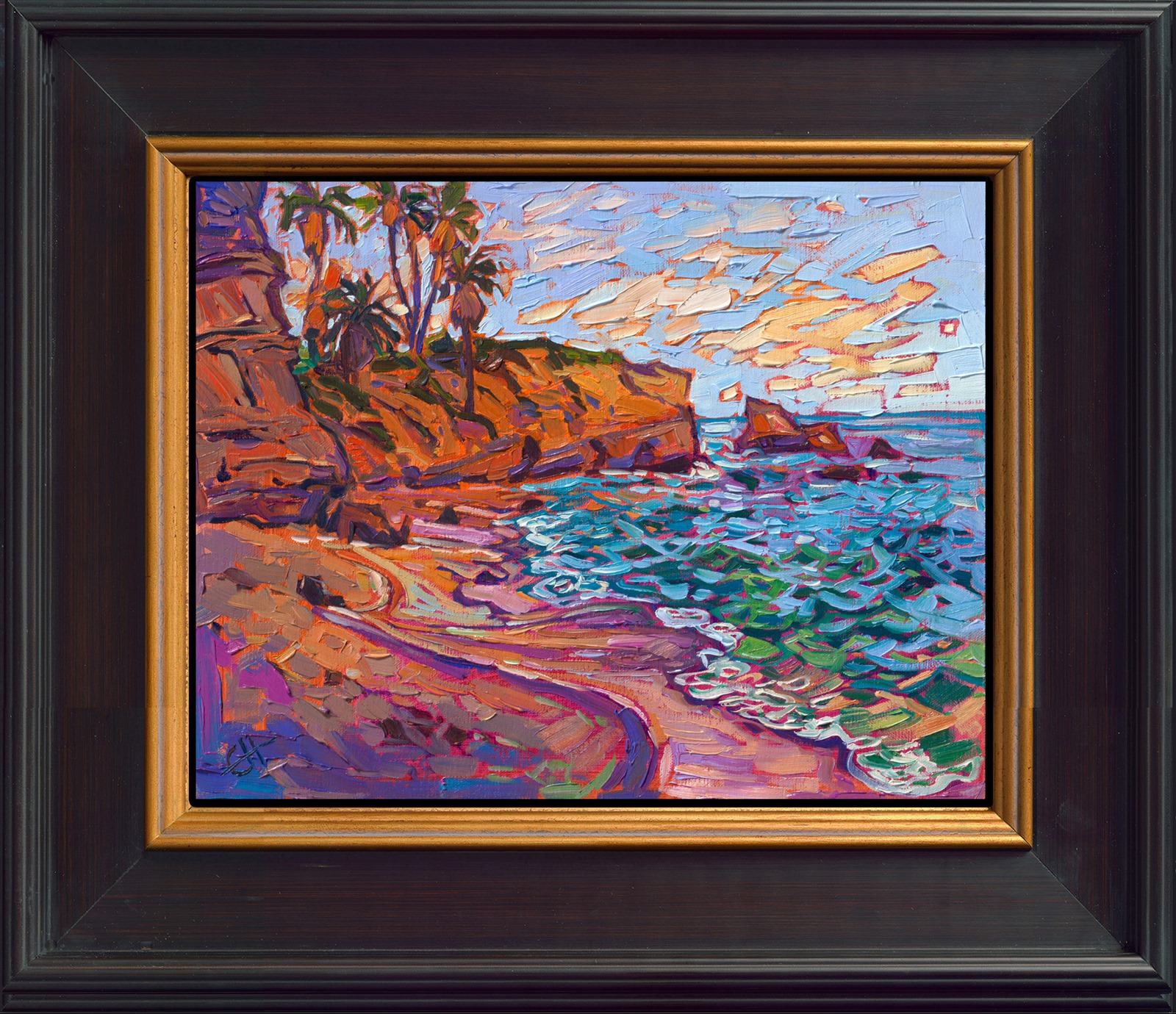La Jolla Cove is one of the prettiest little beaches in southern California. Nestled at the outskirts of San Diego, the Cove is a great place to catch a sunrise and go for a stroll. This petite painting captures the colors and movement of the Pacific Coast.