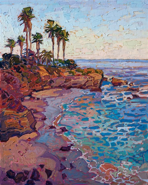 The La Jolla Cove is captured in vivid, impressionistic strokes of oil paint. The foaming waters below swirl and glimmer in the changing light.
