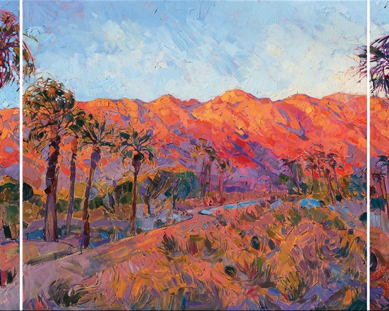 Note on varnishing: Erin’s paintings take six to eight weeks to dry, at which time we apply a retouching varnish, which allows the painting to complete the curing process while having a layer of protection against dirt and scuffs. The full curing process for an impasto oil painting takes at least two years. We are happy to assist in applying a final finishing varnish to your Erin Hanson oil painting once it has been dry for at least two years. Here is more information on how to care for your original oil painting.