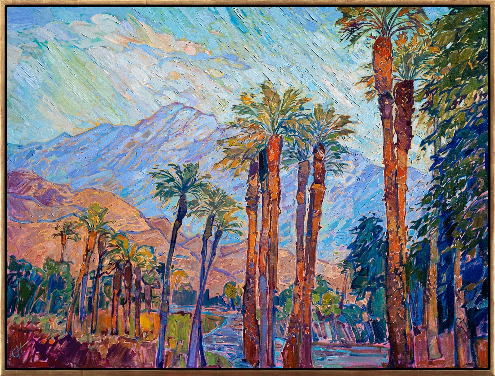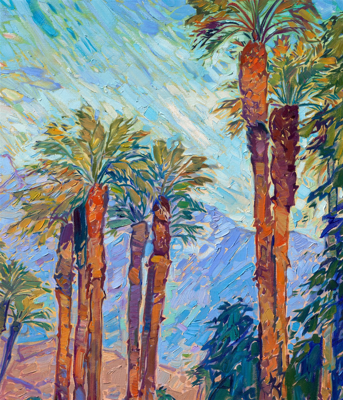 I have been doing shows in La Quinta and Palm Springs for almost twenty years. Every time I return to the desert, I am blown away again by the beautiful colors of the mountains and palm trees--especially during early morning golden hour and sunset. This painting captures a view from Highway 111, where you can see the San Juacinto mountains dusted in snow in the distance, peeking between the lanky palms.
