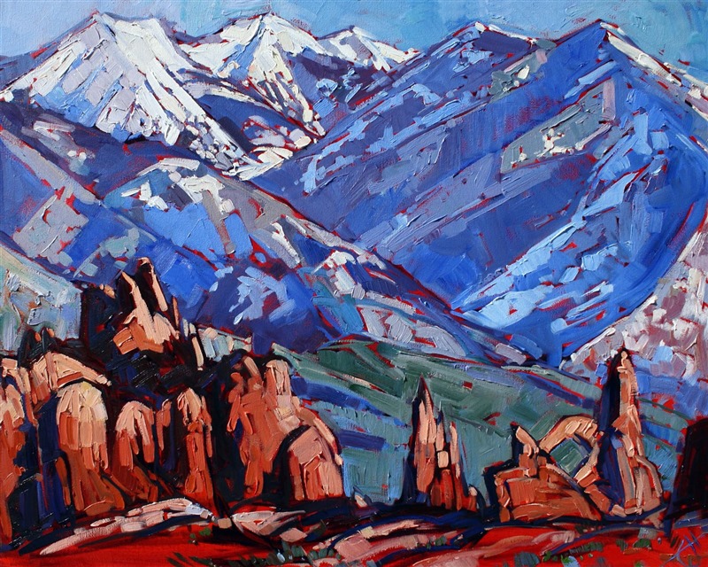 Style: "Open Impressionism" is a new style of painting developed by American artist Erin Hanson. The style is characterized by short, impasto brush strokes that are applied without layering, creating a mosaic or stained-glass appearance to the paintings. The paintings are created with a limited palette of colors, applied without blending or mixing upon the canvas, which adds a dimension of texture to each brush stroke. Inspired by classic impressionism, pointillism, and post-impressionism, Erin Hanson continues the tradition of impressionism into the modern day with her colorful and vivacious landscape paintings.