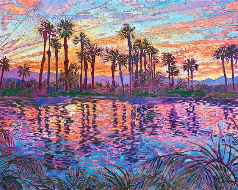 Note on varnishing: Erin’s paintings take six to eight weeks to dry, at which time we apply a retouching varnish, which allows the painting to complete the curing process while having a layer of protection against dirt and scuffs. The full curing process for an impasto oil painting takes at least two years. We are happy to assist in applying a final finishing varnish to your Erin Hanson oil painting once it has been dry for at least two years. Here is more information on how to care for your original oil painting.