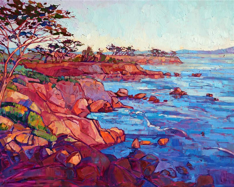 Monterey is a beautiful place to paint, the landscape full of brilliant contrasts and unusual color, from the red and purple rocks among the crystal blue waters, to the pastel skies reflected upon wispy cypress trees. This painting captures the rocky Monterey coastline just north of Lover's Point.