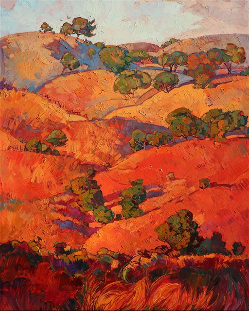 Style: "Open Impressionism" is a new style of painting developed by American artist Erin Hanson. The style is characterized by short, impasto brush strokes that are applied without layering, creating a mosaic or stained-glass appearance to the paintings. The paintings are created with a limited palette of colors, applied without blending or mixing upon the canvas, which adds a dimension of texture to each brush stroke. Inspired by classic impressionism, pointillism, and post-impressionism, Erin Hanson continues the tradition of impressionism into the modern day with her colorful and vivacious landscape paintings.