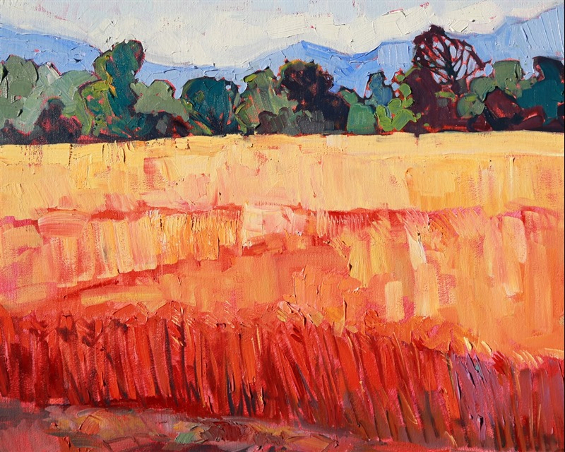 The thick, lush wheat fields of central Oregon turn beautiful shades of orange and gold in July. The distant mountains are blue in the summer atmosphere. This painting embodies the loose, impressionistic style of the artist.