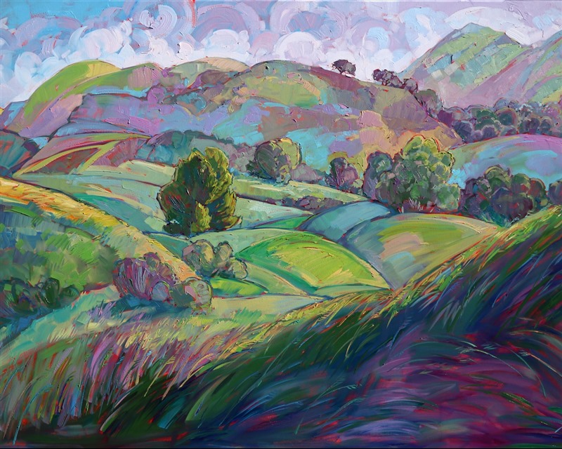 Style: "Open Impressionism" is a new style of painting developed by American artist Erin Hanson. The style is characterized by short, impasto brush strokes that are applied without layering, creating a mosaic or stained-glass appearance to the paintings. The paintings are created with a limited palette of colors, applied without blending or mixing upon the canvas, which adds a dimension of texture to each brush stroke. Inspired by classic impressionism, pointillism, and post-impressionism, Erin Hanson continues the tradition of impressionism into the modern day with her colorful and vivacious landscape paintings.