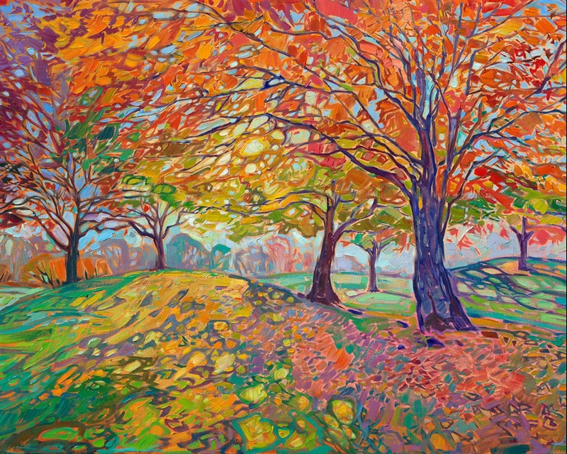 This Halloween-colored painting celebrates everything I love about the fall. The light shining through the maple trees creates intriguing patterns of light and shadow across the grass. Thick brush strokes of oil paint laid side-by-side, without layering, create an impactful mosaic of color and texture across the canvas. This painting was created in my signature Open Impressionism style.
