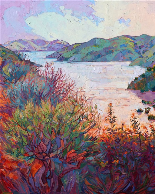 Thick brush strokes and bold color make this landscape of central California pop with life and movement. This painting of Whale Rock Reservoir, near Paso Robles' wine country, brings to your home the delicate light of dawn in lavender curves and distant green hills.