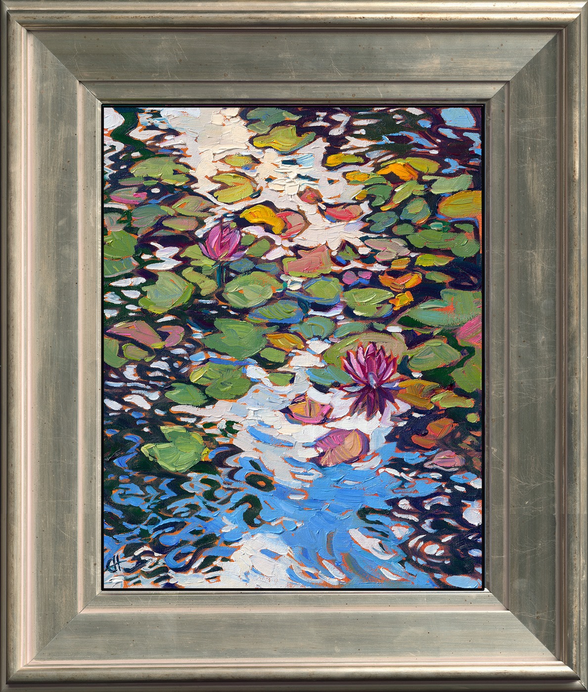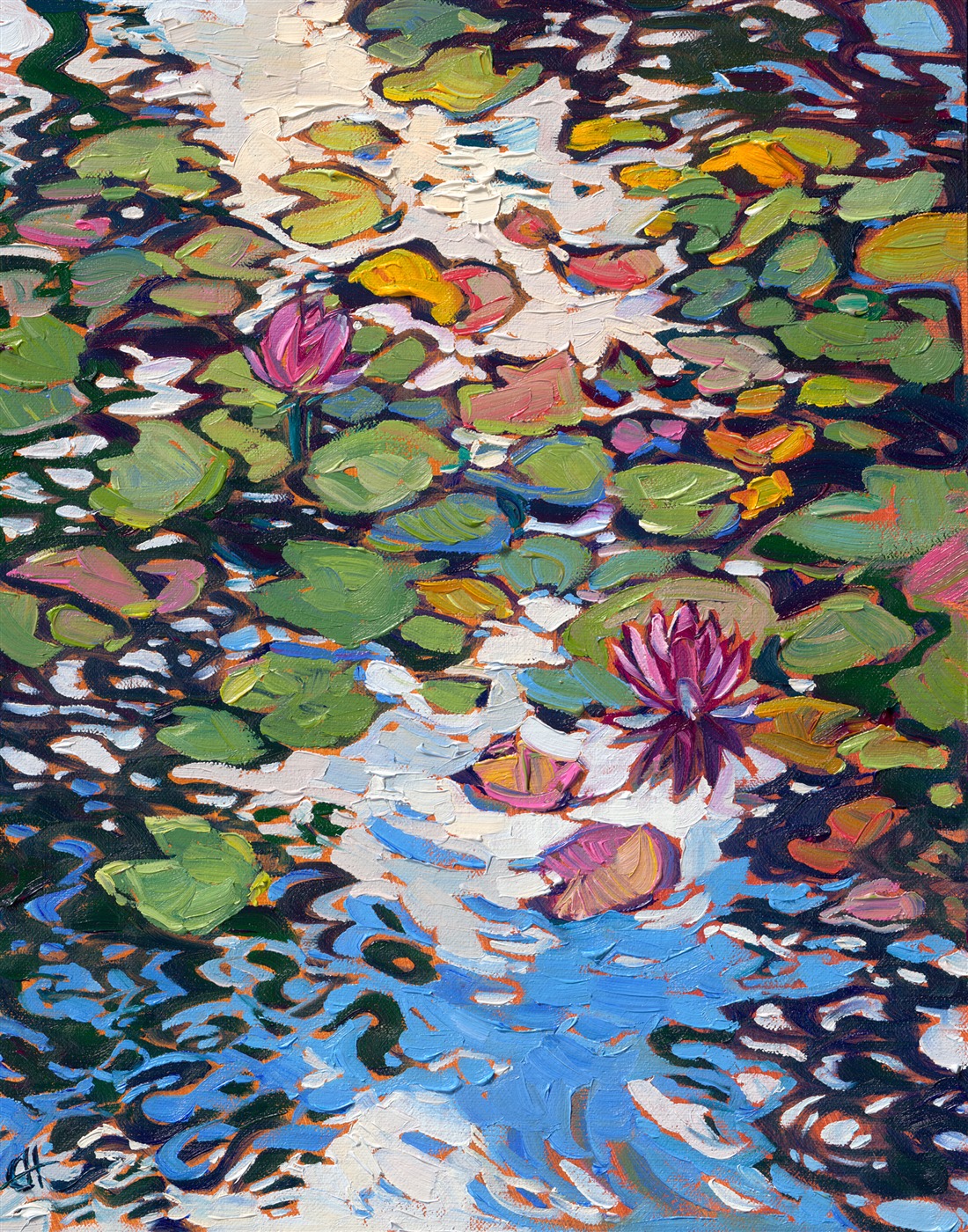 Erin Hanson, creator of Open Impressionism, captures Monet's water lily garden with thick, expressive brush strokes of oil paint. The ever-changing reflections of blue sky and clouds move in and out of the tree's reflections.