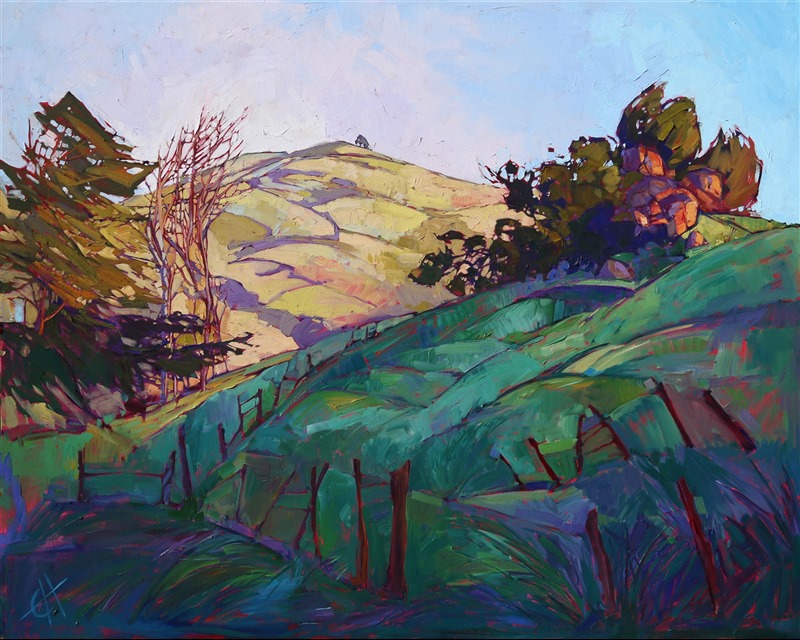 Style: "Open Impressionism" is a new style of painting developed by American artist Erin Hanson. The style is characterized by short, impasto brush strokes that are applied without layering, creating a mosaic or stained-glass appearance to the paintings. The paintings are created with a limited palette of colors, applied without blending or mixing upon the canvas, which adds a dimension of texture to each brush stroke. Inspired by classic impressionism, pointillism, and post-impressionism, Erin Hanson continues the tradition of impressionism into the modern day with her colorful and vivacious landscape paintings.