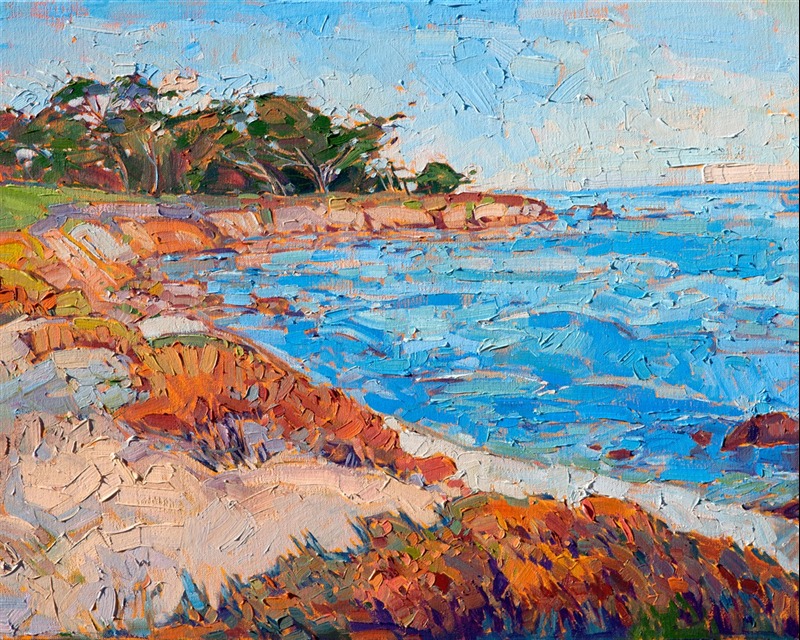 The color-drenched Monterey coastline curves among the wispy cypress trees in this impasto oil painting. The brush strokes are thick and impressionistic, creating a mosaic of color and texture.
