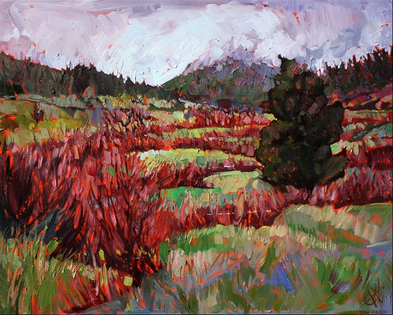 Style: "Open Impressionism" is a new style of painting developed by American artist Erin Hanson. The style is characterized by short, impasto brush strokes that are applied without layering, creating a mosaic or stained-glass appearance to the paintings. The paintings are created with a limited palette of colors, applied without blending or mixing upon the canvas, which adds a dimension of texture to each brush stroke. Inspired by classic impressionism, pointillism, and post-impressionism, Erin Hanson continues the tradition of impressionism into the modern day with her colorful and vivacious landscape paintings.