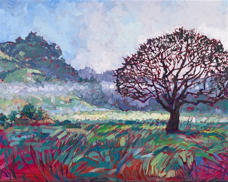 Style: "Open Impressionism" is a new style of painting developed by American artist Erin Hanson. The style is characterized by short, impasto brush strokes that are applied without layering, creating a mosaic or stained-glass appearance to the paintings. The paintings are created with a limited palette of colors, applied without blending or mixing upon the canvas, which adds a dimension of texture to each brush stroke. Inspired by classic impressionism, pointillism, and post-impressionism, Erin Hanson continues the tradition of impressionism into the modern day with her colorful and vivacious landscape paintings.