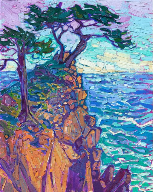This oil painting captures the colors of Carmel with thick, impressionistic brush strokes. The contrast between the sunset-colored rocks and the turquoise waves creates a sense of movement and excitement within the piece. Erin Hanson's modern style of painting is called Open Impressionism, and it involves placing brush strokes side-by-side, without layering. The effect is a stained-glass or mosaic look to her oil paintings.