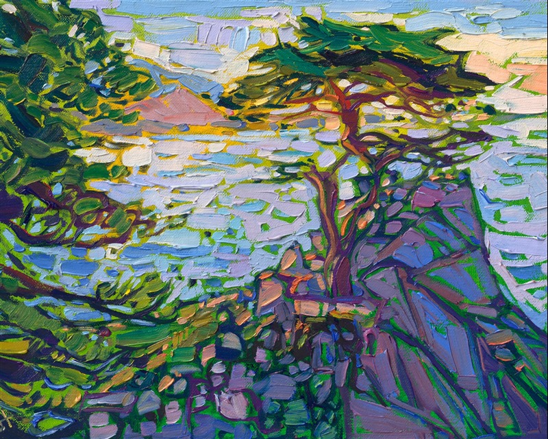 "Lone Cypress Spring" is an original oil painting on linen board, by Erin Hanson. The piece arrives framed in a black and gold plein air frame.