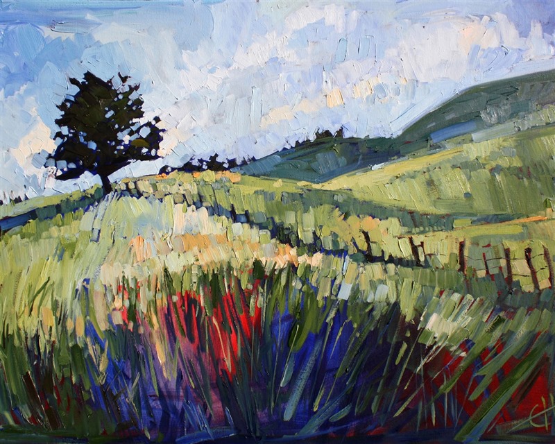 Style: "Open Impressionism" is a new style of painting developed by American artist Erin Hanson. The style is characterized by short, impasto brush strokes that are applied without layering, creating a mosaic or stained-glass appearance to the paintings. The paintings are created with a limited palette of colors, applied without blending or mixing upon the canvas, which adds a dimension of texture to each brush stroke. Inspired by classic impressionism, pointillism, and post-impressionism, Erin Hanson continues the tradition of impressionism into the modern day with her colorful and vivacious landscape paintings.