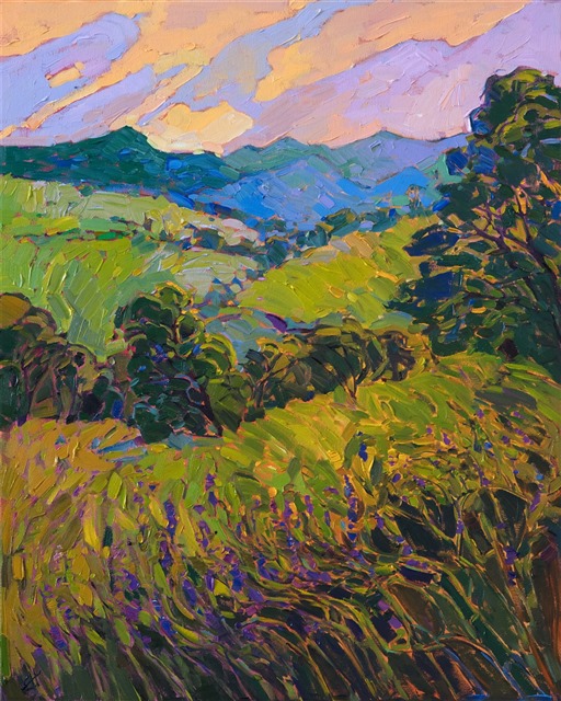 This painting was inspired by a hillside near Paso Robles that was covered in purple lupin wildflowers. The warm afternoon light glints off the rounded oak trees and makes the sky glow with color. I use thick, textural brush strokes to evoke a sense of movement within the painting.