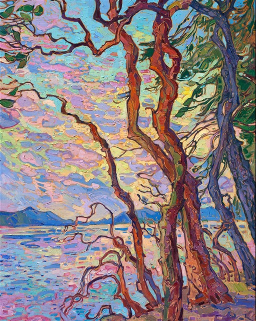 Washington's madrone trees are so fun to paint--their twisting, twirling, multi-colored bark is captured in thick, expressive brush strokes of oil paint. A sunrise-colored sky fills the background in this painting of the San Juan islands.