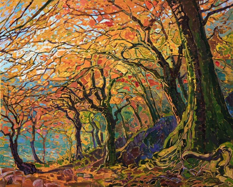 Style: "Open Impressionism" is a new style of painting developed by American artist Erin Hanson. The style is characterized by short, impasto brush strokes that are applied without layering, creating a mosaic or stained-glass appearance to the paintings. The paintings are created with a limited palette of colors, applied without blending or mixing upon the canvas, which adds a dimension of texture to each brush stroke. Inspired by classic impressionism, pointillism, and post-impressionism, Erin Hanson continues the tradition of impressionism into the modern day with her colorful and vivacious landscape paintings.