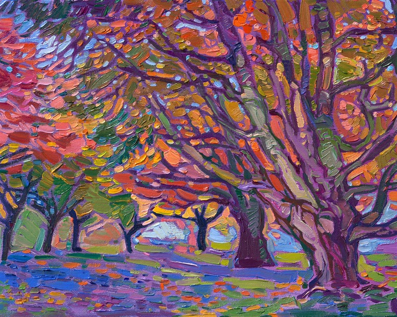 Style: "Open Impressionism" is a new style of painting developed by American artist Erin Hanson. The style is characterized by short, impasto brush strokes that are applied without layering, creating a mosaic or stained-glass appearance to the paintings. The paintings are created with a limited palette of colors, applied without blending or mixing upon the canvas, which adds a dimension of texture to each brush stroke. Inspired by classic impressionism, pointillism, and post-impressionism, Erin Hanson continues the tradition of impressionism into the modern day with her colorful and vivacious landscape paintings.