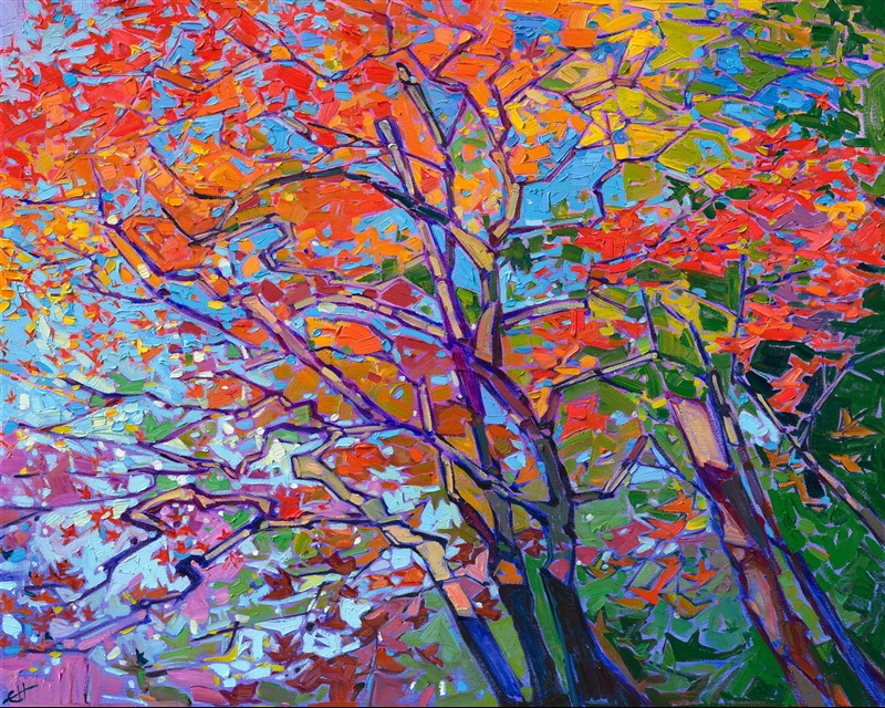 "Maple Sky" was created on 1-1/2" deep linen. The oil painting arrives framed in a contemporary gold floater frame, ready to hang.