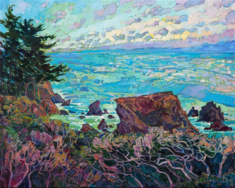 Style: "Open Impressionism" is a new style of painting developed by American artist Erin Hanson. The style is characterized by short, impasto brush strokes that are applied without layering, creating a mosaic or stained-glass appearance to the paintings. The paintings are created with a limited palette of colors, applied without blending or mixing upon the canvas, which adds a dimension of texture to each brush stroke. Inspired by classic impressionism, pointillism, and post-impressionism, Erin Hanson continues the tradition of impressionism into the modern day with her colorful and vivacious landscape paintings.
