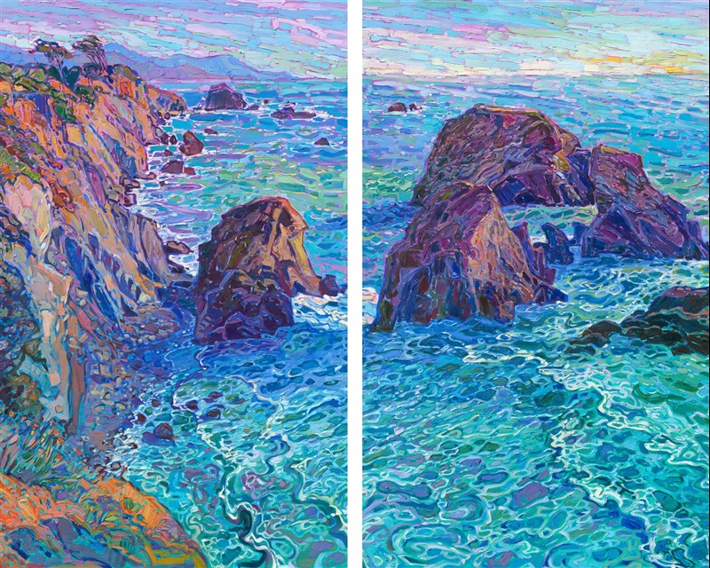 Mendocino waters glimmer in hues of turquoise and ultramarine blue. Thick brush strokes placed side by side capture the crystalline effect of light and shadow. This piece will be on display at Erin Hanson's solo museum show Erin Hanson: Alchemist of Color at the Channel Islands Maritime Museum in Oxnard, California.