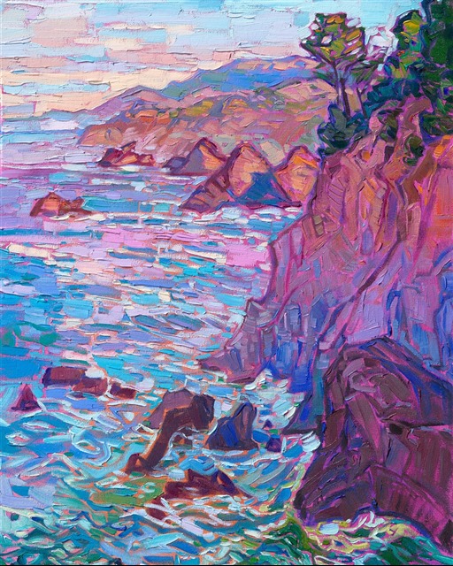 Style: "Open Impressionism" is a new style of painting developed by American artist Erin Hanson. The style is characterized by short, impasto brush strokes that are applied without layering, creating a mosaic or stained-glass appearance to the paintings. The paintings are created with a limited palette of colors, applied without blending or mixing upon the canvas, which adds a dimension of texture to each brush stroke. Inspired by classic impressionism, pointillism, and post-impressionism, Erin Hanson continues the tradition of impressionism into the modern day with her colorful and vivacious landscape paintings.