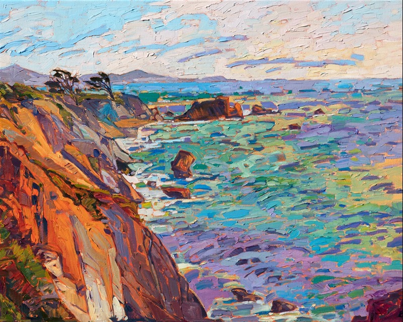 Sunset light illuminates the coastline of Mendocino. The colorful rocks are layered in vivid shades of rust and lavender. The brush strokes are thick and impressionistic, alive with texture and movement. This painting captures all the beauty of the California coast.