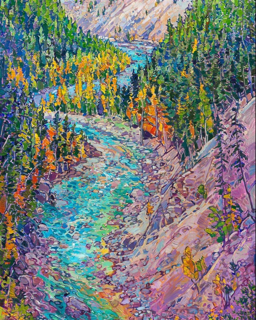 Style: "Open Impressionism" is a new style of painting developed by American artist Erin Hanson. The style is characterized by short, impasto brush strokes that are applied without layering, creating a mosaic or stained-glass appearance to the paintings. The paintings are created with a limited palette of colors, applied without blending or mixing upon the canvas, which adds a dimension of texture to each brush stroke. Inspired by classic impressionism, pointillism, and post-impressionism, Erin Hanson continues the tradition of impressionism into the modern day with her colorful and vivacious landscape paintings.
