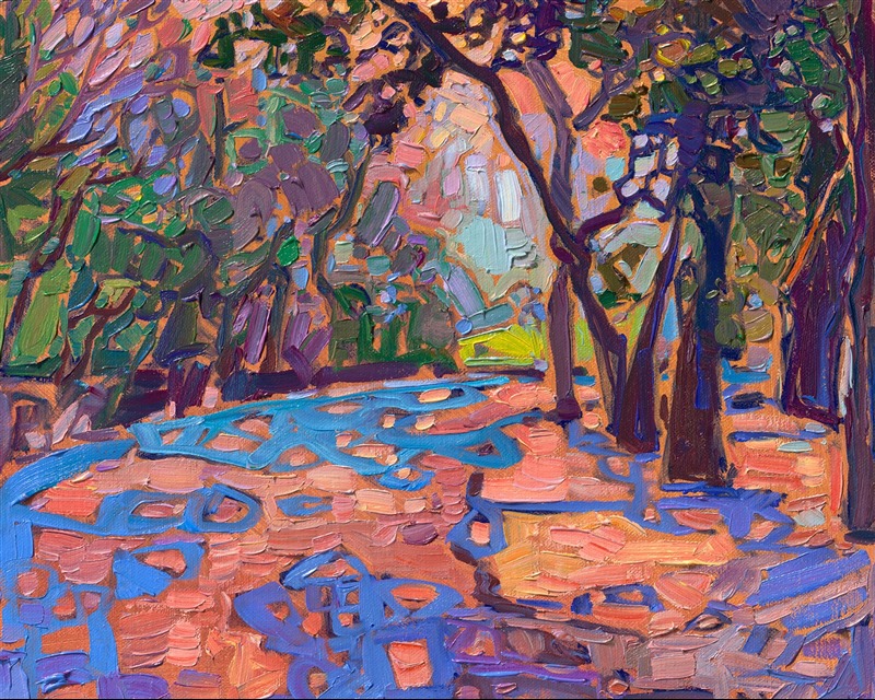 Style: "Open Impressionism" is a new style of painting developed by American artist Erin Hanson. The style is characterized by short, impasto brush strokes that are applied without layering, creating a mosaic or stained-glass appearance to the paintings. The paintings are created with a limited palette of colors, applied without blending or mixing upon the canvas, which adds a dimension of texture to each brush stroke. Inspired by classic impressionism, pointillism, and post-impressionism, Erin Hanson continues the tradition of impressionism into the modern day with her colorful and vivacious landscape paintings.