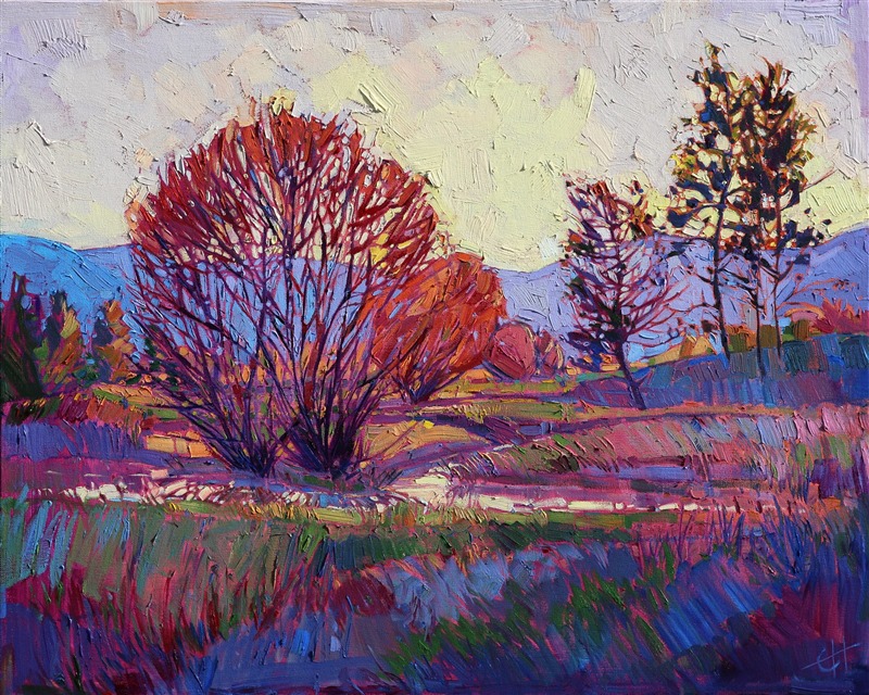 Style: "Open Impressionism" is a new style of painting developed by American artist Erin Hanson. The style is characterized by short, impasto brush strokes that are applied without layering, creating a mosaic or stained-glass appearance to the paintings. The paintings are created with a limited palette of colors, applied without blending or mixing upon the canvas, which adds a dimension of texture to each brush stroke. Inspired by classic impressionism, pointillism, and post-impressionism, Erin Hanson continues the tradition of impressionism into the modern day with her colorful and vivacious landscape paintings.