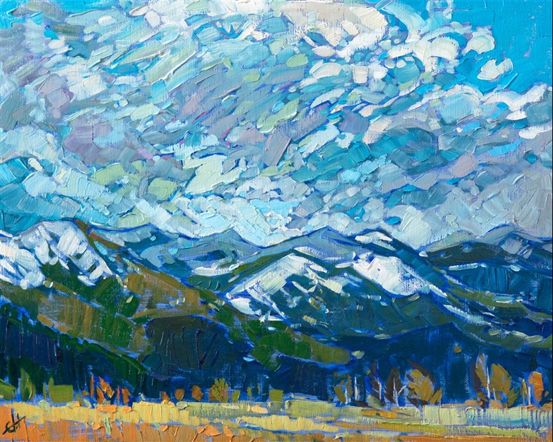 Style: "Open Impressionism" is a new style of painting developed by American artist Erin Hanson. The style is characterized by short, impasto brush strokes that are applied without layering, creating a mosaic or stained-glass appearance to the paintings. The paintings are created with a limited palette of colors, applied without blending or mixing upon the canvas, which adds a dimension of texture to each brush stroke. Inspired by classic impressionism, pointillism, and post-impressionism, Erin Hanson continues the tradition of impressionism into the modern day with her colorful and vivacious landscape paintings.
