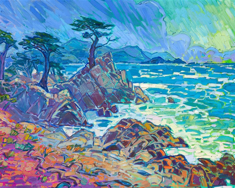 Vibrant hues of turquoise and blue seem to leap from the canvas in this impressionistic depiction of Monterey, California. Each brush stroke is alive with energy and color, capturing the fresh air of the outdoors.