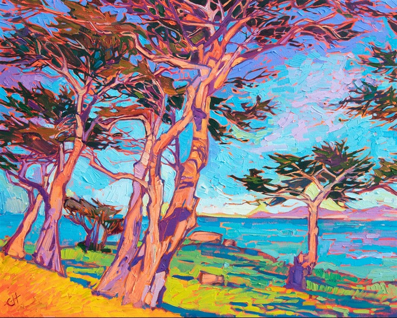 "Monterey" was created on 1-1/2" canvas, with the painting continued around the edges. The brush strokes are thick and impressionistic, capturing the movement of the trees. The painting arrives framed in a 23kt gold floater frame.