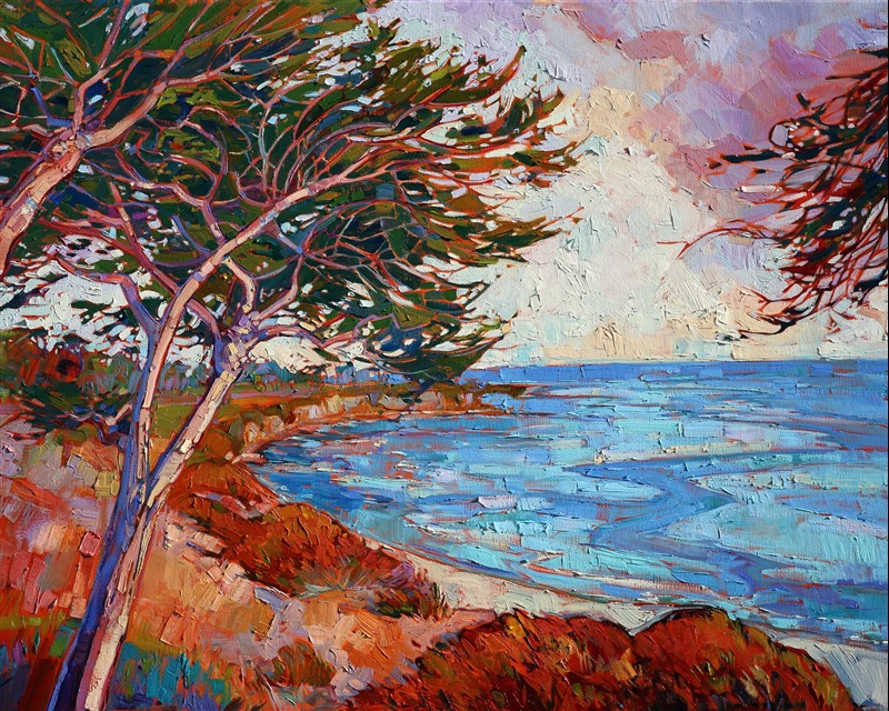 Thickly applied oil paint bursts from the canvas in rich texture and vivid color, transporting you to the beautiful landscape of Monterey. The iconic California cypress trees burst with color and motion, creating an emotional impact in the viewer.