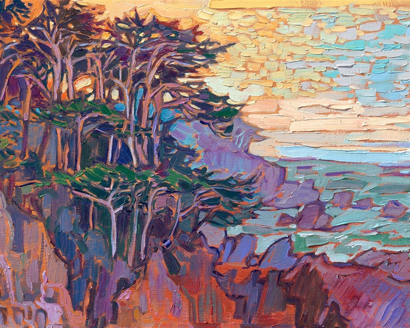 There is a little nook I like to photograph when I visit Carmel that has one of the best painting views, in my opinion. I have to scramble underneath a bridge, get snagged by a few blackberry bushes, and end up crouching precariously on the edge of steep cliff -- but the view of overlapping cypress trees and dramatic rock formations is totally worth it.