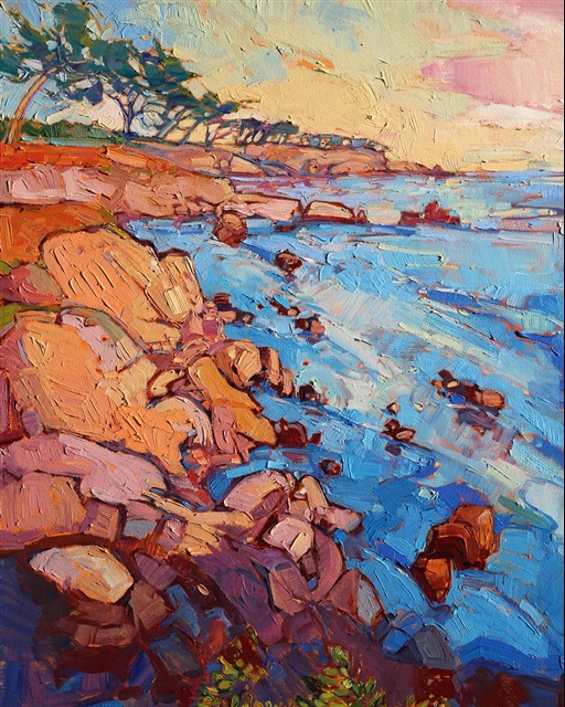 Monterey rocks burst in colors of lavender of sherbet orange in the early light of dawn. The brush strokes in this painting are loose and impressionistic.